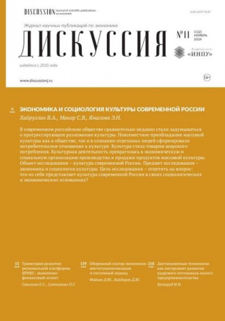 «Дискуссия» – это журнал для ученых и практиков, для аспирантов и докторантов, для докторов наук и студентов – всех, кто стремится к преодолению «дисциплинарных границ» между науками и к решению проблем социальной жизни. Экономический журнал научных публикаций «Дискуссия» включен в Перечень журналов ВАК (Перечень ведущих рецензируемых научных журналов и изданий, в которых должны быть опубликованы основные научные результаты диссертаций на соискание ученых степеней доктора и кандидата наук) по специальностям: 5.2.1. Экономическая теория (экономические науки), 5.2.2. Математические, статистические и инструментальные методы в экономике (экономические науки), 5.2.3. Региональная и отраслевая экономика (экономические науки), 5.2.4. Финансы (экономические науки), 5.2.5. Мировая экономика (экономические науки), 5.2.6. Менеджмент (экономические науки), а также в систему Российского индекса научного цитирования.