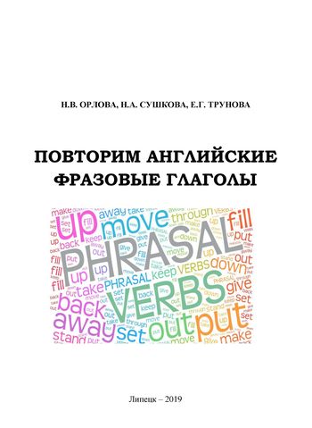 Орлова, Н. В. Повторим английские фразовые глаголы : учебно-методическое пособие / Н. В. Орлова, Н. А. Сушкова, Е. Г. Трунова. — Липецк : Липецкий государственный педагогический университет имени П.П. Семёнова-Тян-Шанского, 2019. — 79 c. — ISBN 978-5-907168-28-2. — Текст : электронный // Цифровой образовательный ресурс IPR SMART : [сайт]. — URL: https://www.iprbookshop.ru/101012.html (дата обращения: 18.07.2024). — Режим доступа: для авторизир. пользователей