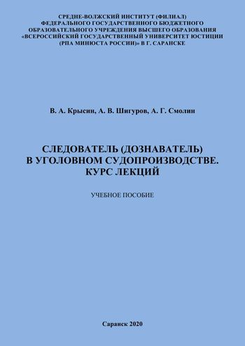 Крысин, В. А. Следователь (дознаватель) в уголовном судопроизводстве. Курс лекций : учебное пособие / В. А. Крысин, А. В. Шигуров, А. Г. Смолин. — Саранск : Средне-Волжский институт (филиал) ВГУЮ (РПА Минюста России), 2020. — 250 c. — ISBN 978-5-6045294-0-9. — Текст : электронный // Цифровой образовательный ресурс IPR SMART : [сайт]. — URL: https://www.iprbookshop.ru/101245.html (дата обращения: 13.12.2023). — Режим доступа: для авторизир. пользователей