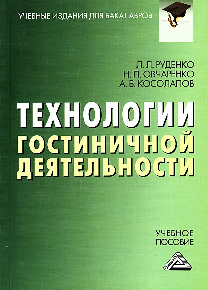 Руденко, Л. Л. Технологии гостиничной деятельности : учебное пособие для бакалавров / Л. Л. Руденко, Н. П. Овчаренко, А. Б. Косолапов. — 3-е изд. — Москва : Дашков и К, Ай Пи Эр Медиа, 2021. — 176 c. — ISBN 978-5-394-04230-0. — Текст : электронный // Цифровой образовательный ресурс IPR SMART : [сайт]. — URL: https://www.iprbookshop.ru/102280.html (дата обращения: 05.05.2022). — Режим доступа: для авторизир. пользователей