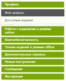 В разделе "Работа с изданиями в режиме online" представлены на сегодняшний день шесть доступных функциональных подраздела: "Избранные издания", "Мои закладки", "Мои конспекты", "История работы", "История поисковых запросов", "Рекомендуемая литература".