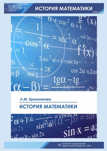 Бронникова, Л. М. История математики : учебное пособие / Л. М. Бронникова. — Барнаул : Алтайский государственный педагогический университет, 2016. — 118 c. — ISBN 978-5-88210-810-5. — Текст : электронный // Цифровой образовательный ресурс IPR SMART : [сайт]. — URL: https://www.iprbookshop.ru/102729.html (дата обращения: 24.07.2023). — Режим доступа: для авторизир. пользователей