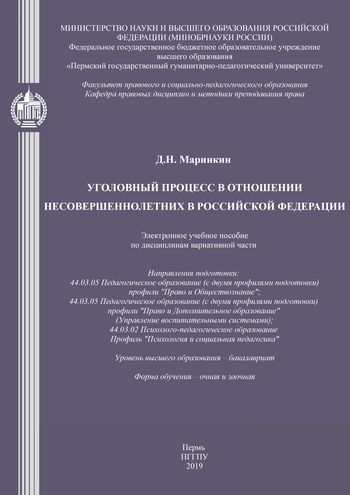 Маринкин Д.Н. Уголовный процесс в отношении несовершеннолетних в Российской Федерации : электронное учебное пособие по дисциплинам вариативной части. Направления подготовки: 44.03.05 Педагогическое образование (с двумя профилями подготовки), профили «Право и Обществознание»; 44.03.05 Педагогическое образование (с двумя профилями подготовки), профили «Право и Дополнительное образование» (Управление воспитательными системами); 44.03.02 Психолого-педагогическое образование, профиль «Психология и социальная педагогика». Уровень высшего образования – бакалавриат. Форма обучения – очная и заочная / Маринкин Д.Н.. — Пермь : Пермский государственный гуманитарно-педагогический университет, 2019. — 102 c. — ISBN 978-5-85219-029-1. — Текст : электронный // Цифровой образовательный ресурс IPR SMART : [сайт]. — URL: https://www.iprbookshop.ru/104178.html (дата обращения: 20.12.2025). — Режим доступа: для авторизир. пользователей