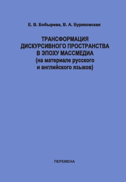 Бобырева, Е. В. Трансформация дискурсивного пространства в эпоху массмедиа (на материале русского и английского языков) : монография / Е. В. Бобырева, В. А. Буряковская. — Волгоград : Волгоградский государственный социально-педагогический университет, «Перемена», 2020. — 209 c. — ISBN 978-5-9935-0423-0. — Текст : электронный // Цифровой образовательный ресурс IPR SMART : [сайт]. — URL: https://www.iprbookshop.ru/105827.html (дата обращения: 04.11.2024). — Режим доступа: для авторизир. пользователей