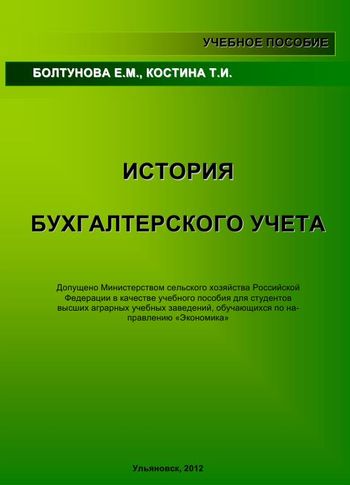 Болтунова, Е. М. История бухгалтерского учета : учебное пособие / Е. М. Болтунова, Т. И. Костина. — Ульяновск : Ульяновская государственная сельскохозяйственная академия им. П.А. Столыпина, 2012. — 146 c. — Текст : электронный // Цифровой образовательный ресурс IPR SMART : [сайт]. — URL: https://www.iprbookshop.ru/109301.html (дата обращения: 02.01.2025). — Режим доступа: для авторизир. пользователей