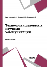 Звягинцева, О. С. Технологии деловых и научных коммуникаций : учебное пособие / О. С. Звягинцева, Д. С. Кенина, О. Н. Бабкина. — Ставрополь : Ставропольский государственный аграрный университет, 2019. — 116 c. — Текст : электронный // Цифровой образовательный ресурс IPR SMART : [сайт]. — URL: https://www.iprbookshop.ru/109404.html (дата обращения: 21.11.2024). — Режим доступа: для авторизир. пользователей
