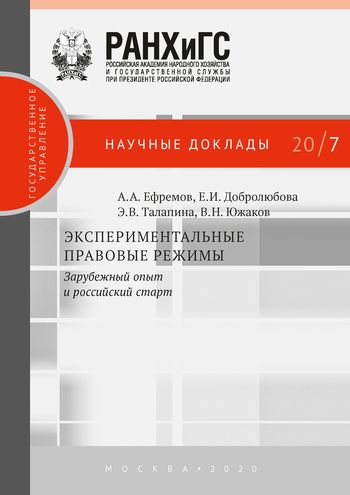 Экспериментальные правовые режимы: зарубежный опыт и российский старт / А. А. Ефремов, Е. И. Добролюбова, Э. В. Талапина, В. Н. Южаков ; под редакцией В. Н. Южакова. — Москва : Дело, 2020. — 126 c. — ISBN 978-5-85006-195-1. — Текст : электронный // Цифровой образовательный ресурс IPR SMART : [сайт]. — URL: https://www.iprbookshop.ru/109903.html (дата обращения: 15.10.2024). — Режим доступа: для авторизир. пользователей