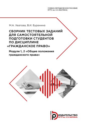 Хватова, М. А. Сборник тестовых заданий для самостоятельной подготовки студентов по дисциплине «Гражданское право». Модули 1, 2 «Общие положения гражданского права» : учебно-методическое пособие / М. А. Хватова, В. И. Буренина. — Москва : Московский государственный технический университет имени Н.Э. Баумана, 2019. — 64 c. — ISBN 978-5-7038-5284-2. — Текст : электронный // Цифровой образовательный ресурс IPR SMART : [сайт]. — URL: https://www.iprbookshop.ru/111303.html (дата обращения: 23.07.2024). — Режим доступа: для авторизир. пользователей