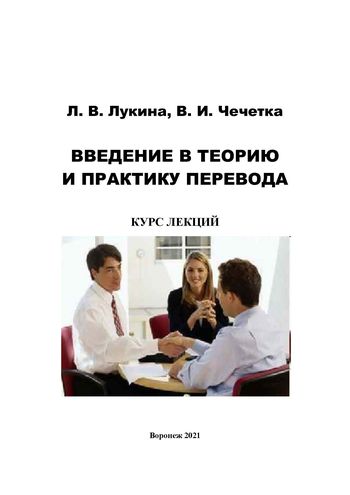 Лукина, Л. В. Введение в теорию и практику перевода : курс лекций / Л. В. Лукина, В. И. Чечетка. — Воронеж : Воронежский государственный технический университет, ЭБС АСВ, 2021. — 96 c. — ISBN 978-5-7731-0912-9. — Текст : электронный // Цифровой образовательный ресурс IPR SMART : [сайт]. — URL: https://www.iprbookshop.ru/111463.html (дата обращения: 20.07.2023). — Режим доступа: для авторизир. пользователей