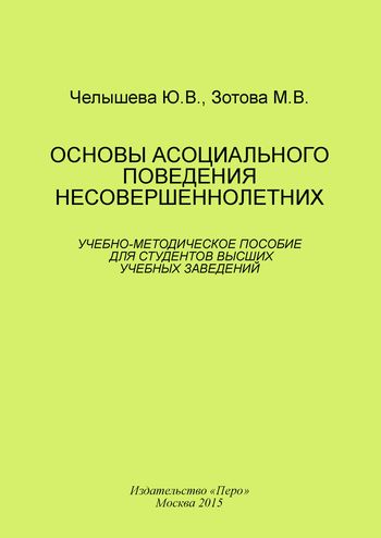Челышева, Ю. В. Основы асоциального поведения несовершеннолетних : учебно-методическое пособие для студентов высших учебных заведений / Ю. В. Челышева, М. В. Зотова. — Москва : Издательство «Перо», 2015. — 93 c. — ISBN 978-5-906835-37-6. — Текст : электронный // Цифровой образовательный ресурс IPR SMART : [сайт]. — URL: https://www.iprbookshop.ru/111586.html (дата обращения: 16.01.2024). — Режим доступа: для авторизир. пользователей