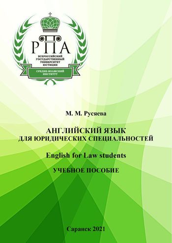 Русяева, М. М. Английский язык для юридических специальностей. English for Law students : учебное пособие / М. М. Русяева. — Саранск : Средне-Волжский институт (филиал) ВГУЮ (РПА Минюста России), 2021. — 103 c. — ISBN 978-5-6046540-9-5. — Текст : электронный // Цифровой образовательный ресурс IPR SMART : [сайт]. — URL: https://www.iprbookshop.ru/115008.html (дата обращения: 20.07.2023). — Режим доступа: для авторизир. пользователей