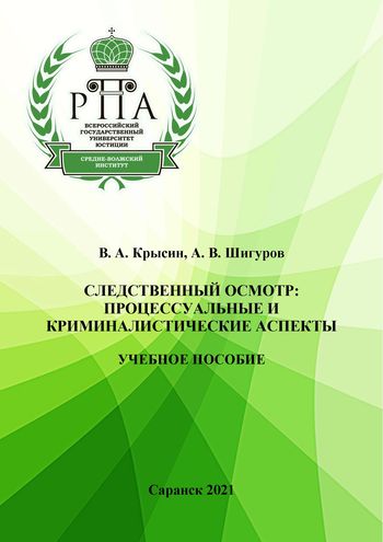 Крысин, В. А. Следственный осмотр: процессуальные и криминалистические аспекты : учебное пособие / В. А. Крысин, А. В. Шигуров. — Саранск : Средне-Волжский институт (филиал) ВГУЮ (РПА Минюста России), 2021. — 146 c. — ISBN 978-5-6046540-7-1. — Текст : электронный // Цифровой образовательный ресурс IPR SMART : [сайт]. — URL: https://www.iprbookshop.ru/115011.html (дата обращения: 01.09.2023). — Режим доступа: для авторизир. пользователей