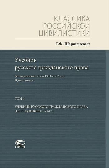 Шершеневич, Г. Ф. Учебник русского гражданского права: (по изданиям 1912 и 1914–1915 гг.). В 2 томах. Т.1 : учебник русского гражданского права: (по 10-му изданию, 1912 г.) / Г. Ф. Шершеневич. — Москва : Статут, 2021. — 838 c. — ISBN 978-5-8354-1766-7 (т.1), 978-5-8354-1765-0. — Текст : электронный // Цифровой образовательный ресурс IPR SMART : [сайт]. — URL: https://www.iprbookshop.ru/117553.html (дата обращения: 02.10.2023). — Режим доступа: для авторизир. пользователей