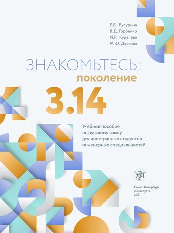 Знакомьтесь: поколение 3,14 : учебное пособие по русскому языку для иностранных студентов инженерных специальностей / Е. В. Бусурина, В. Д. Горбенко, И. Р. Куралёва, М. Ю. Дьякова. — Санкт-Петербург : Златоуст, 2021. — 168 c. — ISBN 978-5-907123-83-0. — Текст : электронный // Цифровой образовательный ресурс IPR SMART : [сайт]. — URL: https://www.iprbookshop.ru/118846.html (дата обращения: 23.05.2023). — Режим доступа: для авторизир. пользователей