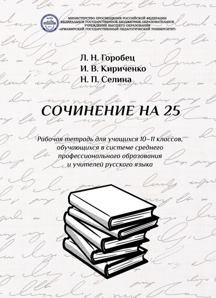 Горобец Л.Н. Сочинение на 25 : рабочая тетрадь для учащихся 10–11 классов, обучающихся в системе среднего профессионального образования и учителей русского языка / Горобец Л.Н., Кириченко И.В., Селина Н.П.. — Армавир : Армавирский государственный педагогический университет, 2021. — 98 c. — ISBN 978-5-89971-852-6. — Текст : электронный // Цифровой образовательный ресурс IPR SMART : [сайт]. — URL: https://www.iprbookshop.ru/118962.html (дата обращения: 05.12.2025). — Режим доступа: для авторизир. пользователей