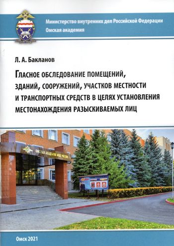 Бакланов, Л. А. Гласное обследование помещений, зданий, сооружений, участков местности и транспортных средств в целях установления местонахождения разыскиваемых лиц : учебное пособие / Л. А. Бакланов. — Омск : Омская академия МВД России, 2021. — 60 c. — ISBN 978-5-88651-757-6. — Текст : электронный // Цифровой образовательный ресурс IPR SMART : [сайт]. — URL: https://www.iprbookshop.ru/119018.html (дата обращения: 28.05.2023). — Режим доступа: для авторизир. пользователей