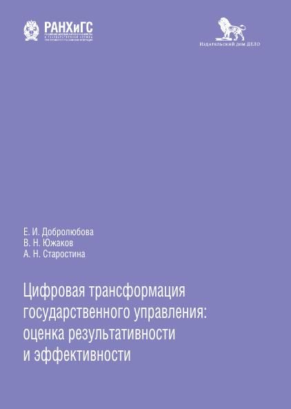 Добролюбова, Е. И. Цифровая трансформация государственного управления: оценка результативности и эффективности / Е. И. Добролюбова, В. Н. Южаков, А. Н. Старостина. — Москва : Дело, 2021. — 234 c. — ISBN 978-5-85006-305-4. — Текст : электронный // Цифровой образовательный ресурс IPR SMART : [сайт]. — URL: https://www.iprbookshop.ru/119174.html (дата обращения: 28.08.2024). — Режим доступа: для авторизир. пользователей