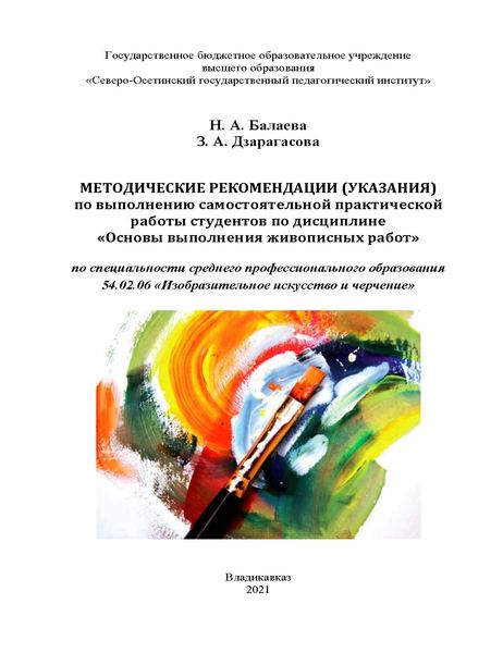 Балаева Н.А. Методические рекомендации (указания) по выполнению самостоятельной практической работы студентов по дисциплине «Основы выполнения живописных работ» по специальности среднего профессионального образования 54.02.06 «Изобразительное искусство и черчение» : учебно-методическое пособие / Балаева Н.А., Дзарагасова З.А.. — Владикавказ : Северо-Осетинский государственный педагогический институт, 2021. — 107 c. — ISBN 978-5-98935-243-2. — Текст : электронный // Цифровой образовательный ресурс IPR SMART : [сайт]. — URL: https://www.iprbookshop.ru/119198.html (дата обращения: 16.12.2025). — Режим доступа: для авторизир. пользователей