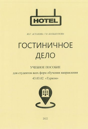 Астахова Ю.Г. Гостиничное дело : учебное пособие для студентов всех форм обучения направления 43.03.02 «Туризм» / Астахова Ю.Г., Большунова Т.В.. — Липецк : Липецкий государственный технический университет, ЭБС АСВ, 2022. — 65 c. — ISBN 978-5-00175-098-7. — Текст : электронный // Цифровой образовательный ресурс IPR SMART : [сайт]. — URL: https://www.iprbookshop.ru/120895.html (дата обращения: 21.12.2025). — Режим доступа: для авторизир. пользователей