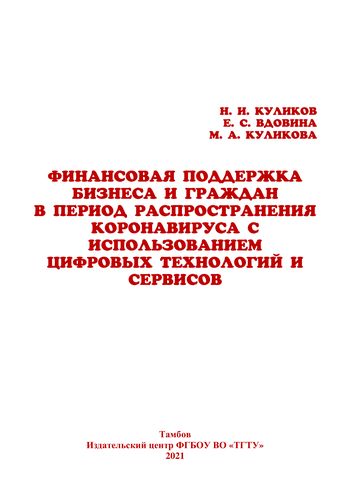 Куликов, Н. И. Финансовая поддержка бизнеса и граждан в период распространения коронавируса с использованием цифровых технологий и сервисов : монография / Н. И. Куликов, Е. С. Вдовина, М. А. Куликова. — Тамбов : Тамбовский государственный технический университет, ЭБС АСВ, 2021. — 80 c. — ISBN 978-5-8265-2405-3. — Текст : электронный // Цифровой образовательный ресурс IPR SMART : [сайт]. — URL: https://www.iprbookshop.ru/122989.html (дата обращения: 19.07.2022). — Режим доступа: для авторизир. пользователей