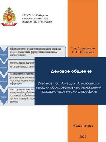Степаненко, Т. А. Деловое общение : учебное пособие для обучающихся высших образовательных учреждений пожарно-технического профиля / Т. А. Степаненко, Т. Н. Пасечкина. — Железногорск : Сибирская пожарно-спасательная академия ГПС МЧС России, 2022. — 153 c. — Текст : электронный // Цифровой образовательный ресурс IPR SMART : [сайт]. — URL: https://www.iprbookshop.ru/123093.html (дата обращения: 22.07.2022). — Режим доступа: для авторизир. пользователей