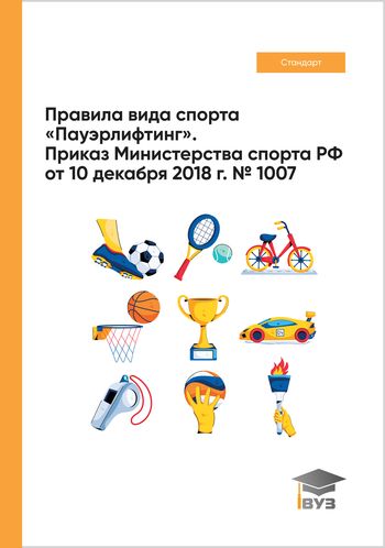 Правила вида спорта «Пауэрлифтинг» : приказ Министерства спорта РФ от 10 декабря 2018 г. № 1007. — Саратов : Вузовское образование, 2022. — 76 c. — ISBN 978-5-4487-0847-3. — Текст : электронный // Цифровой образовательный ресурс IPR SMART : [сайт]. — URL: https://www.iprbookshop.ru/123587.html (дата обращения: 31.08.2022). — Режим доступа: для авторизир. пользователей