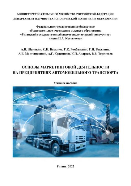 Основы маркетинговой деятельности на предприятиях автомобильного транспорта : учебное пособие / А. В. Шемякин, С. Н. Борычев, Г. К. Рембалович [и др.]. — Рязань : Рязанский государственный агротехнологический университет имени П.А. Костычева, 2022. — 166 c. — ISBN 978-5-98660-395-4. — Текст : электронный // Цифровой образовательный ресурс IPR SMART : [сайт]. — URL: https://www.iprbookshop.ru/123659.html (дата обращения: 05.09.2022). — Режим доступа: для авторизир. пользователей