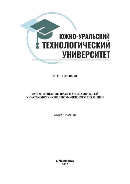 Горюнов, В. Е. Формирование прав и обязанностей участкового уполномоченного полиции : монография / В. Е. Горюнов. — Челябинск : Южно-Уральский технологический университет, 2022. — 173 c. — ISBN 978-5-6047814-8-7. — Текст : электронный // Цифровой образовательный ресурс IPR SMART : [сайт]. — URL: https://www.iprbookshop.ru/125040.html (дата обращения: 18.10.2022). — Режим доступа: для авторизир. пользователей