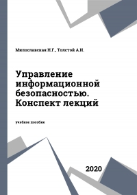 Милославская, Н. Г. Управление информационной безопасностью. Конспект лекций : учебное пособие / Н. Г. Милославская, А. И. Толстой. — Москва : Национальный исследовательский ядерный университет «МИФИ», 2020. — 534 c. — ISBN 978-5-7262-2694-1. — Текст : электронный // Цифровой образовательный ресурс IPR SMART : [сайт]. — URL: https://www.iprbookshop.ru/125513.html (дата обращения: 23.12.2023). — Режим доступа: для авторизир. пользователей