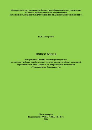 Титаренко, И. Ж. Ноксология : учебное пособие / И. Ж. Титаренко. — Калининград : Издательство ФГБОУ ВПО «КГТУ», 2014. — 171 c. — Текст : электронный // Цифровой образовательный ресурс IPR SMART : [сайт]. — URL: https://www.iprbookshop.ru/125775.html (дата обращения: 11.11.2022). — Режим доступа: для авторизир. пользователей