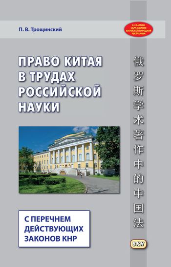 Трощинский, П. В. Право Китая в трудах российской науки (с перечнем действующих законов КНР) = 俄罗斯学术著作中的中国法 含中华人民共和国现行法律目录 / П. В. Трощинский. — Москва : Издательский дом ВКН, 2020. — 96 c. — ISBN 978-5-907086-36-4. — Текст : электронный // Цифровой образовательный ресурс IPR SMART : [сайт]. — URL: https://www.iprbookshop.ru/125937.html (дата обращения: 16.11.2022). — Режим доступа: для авторизир. пользователей