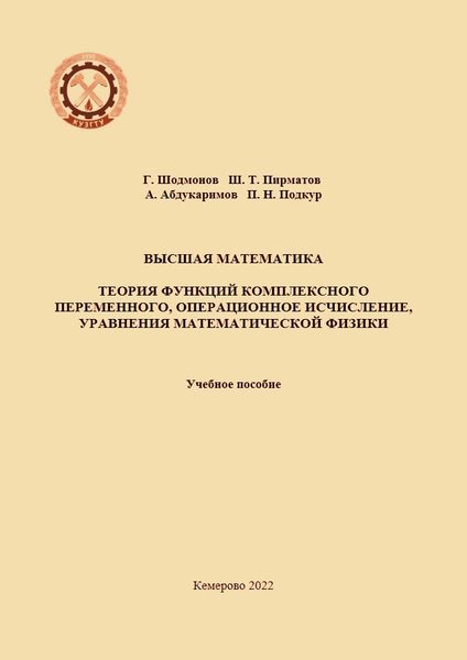 Высшая математика. Теория функций комплексного переменного, операционное исчисление, уравнения математической физики : учебное пособие / Г. Шодмонов, Ш. Т. Пирматов, А. Абдукаримов, П. Н. Подкур. — Кемерово : Кузбасский государственный технический университет имени Т.Ф. Горбачева, 2022. — 124 c. — ISBN 978-5-00137-323-0. — Текст : электронный // Цифровой образовательный ресурс IPR SMART : [сайт]. — URL: https://www.iprbookshop.ru/128391.html (дата обращения: 21.02.2023). — Режим доступа: для авторизир. пользователей