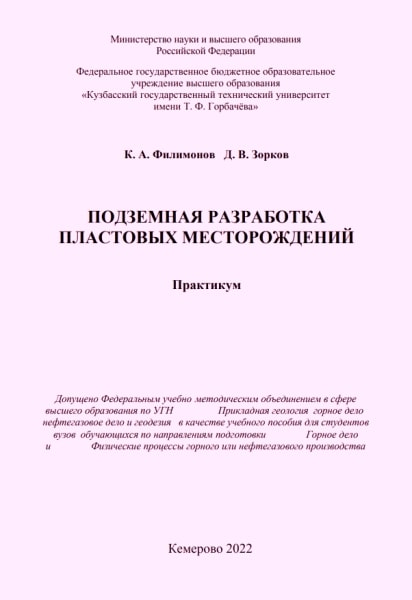 Филимонов, К. А. Подземная разработка пластовых месторождений : практикум / К. А. Филимонов, Д. В. Зорков. — Кемерово : Кузбасский государственный технический университет имени Т.Ф. Горбачева, 2022. — 437 c. — ISBN 978-5-00137-298-1. — Текст : электронный // Цифровой образовательный ресурс IPR SMART : [сайт]. — URL: https://www.iprbookshop.ru/128400.html (дата обращения: 21.02.2023). — Режим доступа: для авторизир. пользователей
