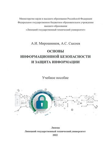 Мирошников А.И. Основы информационной безопасности и защита информации : учебное пособие / Мирошников А.И., Сысоев А.С.. — Липецк : Липецкий государственный технический университет, ЭБС АСВ, 2022. — 107 c. — ISBN 978-5-00175-160-1. — Текст : электронный // Цифровой образовательный ресурс IPR SMART : [сайт]. — URL: https://www.iprbookshop.ru/128718.html (дата обращения: 20.12.2025). — Режим доступа: для авторизир. пользователей