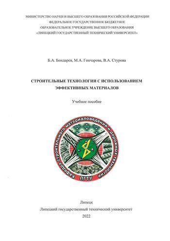 Бондарев, Б. А. Строительные технологии с использованием эффективных материалов : учебное пособие / Б. А. Бондарев, М. А. Гончарова, В. А. Стурова. — Липецк : Липецкий государственный технический университет, ЭБС АСВ, 2022. — 88 c. — ISBN 975-5-00175-164-9. — Текст : электронный // Цифровой образовательный ресурс IPR SMART : [сайт]. — URL: https://www.iprbookshop.ru/128725.html (дата обращения: 12.03.2023). — Режим доступа: для авторизир. пользователей