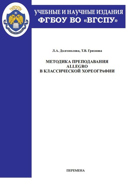 Долгополова, Л. А. Методика преподавания allegro в классической хореографии : учебно-методическое пособие / Л. А. Долгополова, Т. В. Грязнова. — Волгоград : Волгоградский государственный социально-педагогический университет, «Перемена», 2023. — 95 c. — ISBN 978-5-9935-0448-3. — Текст : электронный // Цифровой образовательный ресурс IPR SMART : [сайт]. — URL: https://www.iprbookshop.ru/129627.html (дата обращения: 14.04.2023). — Режим доступа: для авторизир. пользователей