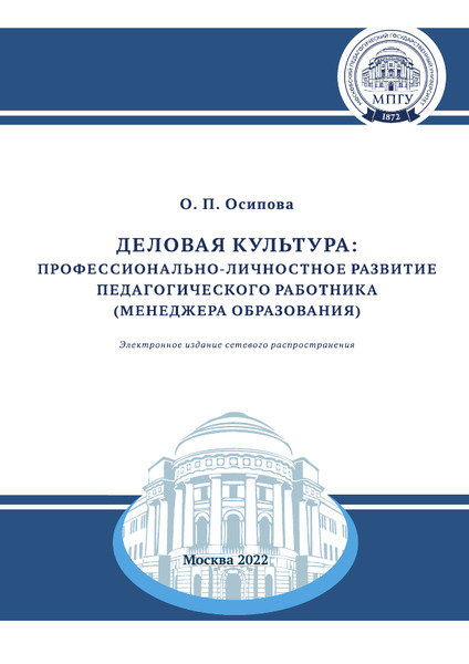 Осипова, О. П. Деловая культура: профессионально-личностное развитие педагогического работника (менеджера образования). 150-летию МПГУ посвящается : учебное пособие / О. П. Осипова. — Москва : Московский педагогический государственный университет, 2022. — 132 c. — ISBN 978-5-4263-1131-2. — Текст : электронный // Цифровой образовательный ресурс IPR SMART : [сайт]. — URL: https://www.iprbookshop.ru/130125.html (дата обращения: 09.05.2023). — Режим доступа: для авторизир. пользователей