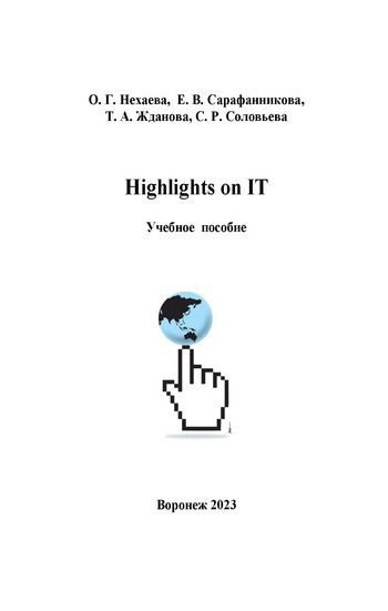Highlights on IT : учебное пособие / О. Г. Нехаева, Е. В. Сарафанникова, Т. А. Жданова, С. Р. Соловьева. — 2-е изд. — Воронеж : Воронежский государственный технический университет, ЭБС АСВ, 2023. — 120 c. — ISBN 978-5-7731-1093-4. — Текст : электронный // Цифровой образовательный ресурс IPR SMART : [сайт]. — URL: https://www.iprbookshop.ru/131034.html (дата обращения: 19.06.2023). — Режим доступа: для авторизир. пользователей