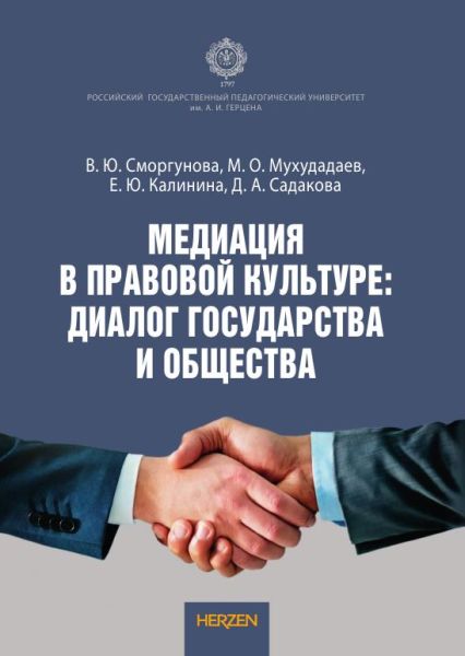 Медиация в правовой культуре: диалог государства и общества : коллективная монография / В. Ю. Сморгунова, М. О. Мухудадаев, Е. Ю. Калинина, Д. А. Садакова. — Санкт-Петербург : Издательство РГПУ им. А. И. Герцена, 2021. — 208 c. — ISBN 978-5-8064-3070-1. — Текст : электронный // Цифровой образовательный ресурс IPR SMART : [сайт]. — URL: https://www.iprbookshop.ru/131722.html (дата обращения: 12.07.2023). — Режим доступа: для авторизир. пользователей