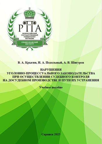 Крысин В.А. Нарушения уголовно-процессуального законодательства при осуществлении судебного контроля на досудебном производстве и пути их устранения : учебное пособие / Крысин В.А., Подольный Н.А., Шигуров А.В.. — Саранск : Средне-Волжский институт (филиал) ВГУЮ (РПА Минюста России), 2023. — 205 c. — ISBN 978-5-6047091-8-4. — Текст : электронный // Цифровой образовательный ресурс IPR SMART : [сайт]. — URL: https://www.iprbookshop.ru/132636.html (дата обращения: 21.12.2025). — Режим доступа: для авторизир. пользователей