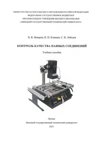 Неверов, В. В. Контроль качества паяных соединений : учебное пособие / В. В. Неверов, П. Н. Клевцов, С. В. Лебедев. — Липецк : Липецкий государственный технический университет, ЭБС АСВ, 2023. — 40 c. — ISBN 978-5-00175-221-9. — Текст : электронный // Цифровой образовательный ресурс IPR SMART : [сайт]. — URL: https://www.iprbookshop.ru/133443.html (дата обращения: 04.10.2023). — Режим доступа: для авторизир. пользователей