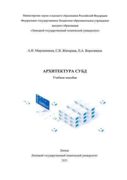 Мирошников, А. И. Архитектура СУБД : учебное пособие / А. И. Мирошников, С. В. Жихорева, П. А. Воротников. — Липецк : Липецкий государственный технический университет, ЭБС АСВ, 2023. — 81 c. — ISBN 978-5-00175-219-6. — Текст : электронный // Цифровой образовательный ресурс IPR SMART : [сайт]. — URL: https://www.iprbookshop.ru/133450.html (дата обращения: 04.10.2023). — Режим доступа: для авторизир. пользователей