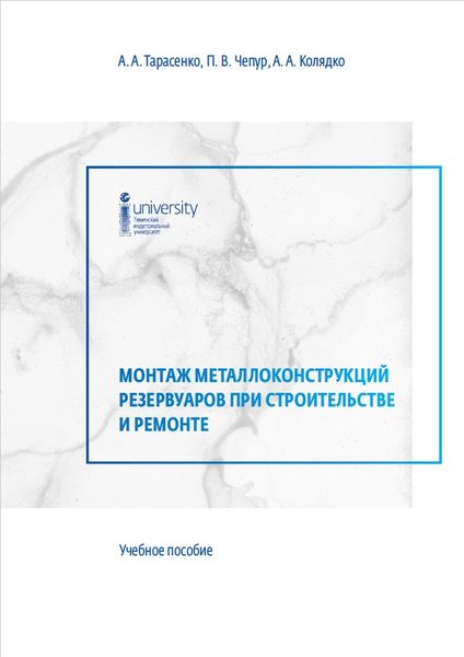 Тарасенко, А. А. Монтаж металлоконструкций резервуаров при строительстве и ремонте : учебное пособие / А. А. Тарасенко, П. В. Чепур, А. А. Колядко. — Тюмень : Тюменский индустриальный университет, 2023. — 80 c. — ISBN 978-5-9961-3067-2. — Текст : электронный // Цифровой образовательный ресурс IPR SMART : [сайт]. — URL: https://www.iprbookshop.ru/133649.html (дата обращения: 18.10.2023). — Режим доступа: для авторизир. пользователей