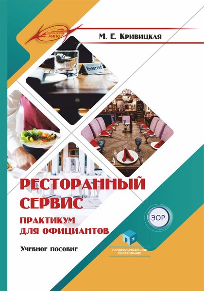 Кривицкая, М. Е. Ресторанный сервис. Практикум для официантов : учебное пособие / М. Е. Кривицкая. — Минск : Республиканский институт профессионального образования (РИПО), 2022. — 204 c. — ISBN 978-985-895-068-2. — Текст : электронный // Цифровой образовательный ресурс IPR SMART : [сайт]. — URL: https://www.iprbookshop.ru/134150.html (дата обращения: 06.11.2023). — Режим доступа: для авторизир. пользователей