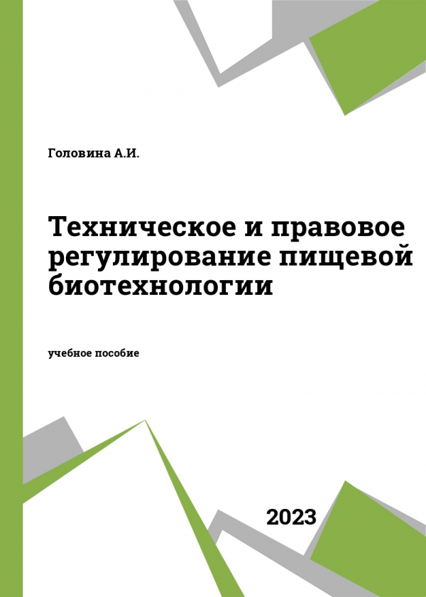 Головина А.И. Техническое и правовое регулирование пищевой биотехнологии : учебное пособие / Головина А.И.. — Санкт-Петербург : Троицкий мост, 2023. — 170 c. — ISBN 978-5-4377-0183-6. — Текст : электронный // Цифровой образовательный ресурс IPR SMART : [сайт]. — URL: https://www.iprbookshop.ru/134377.html (дата обращения: 20.12.2025). — Режим доступа: для авторизир. пользователей