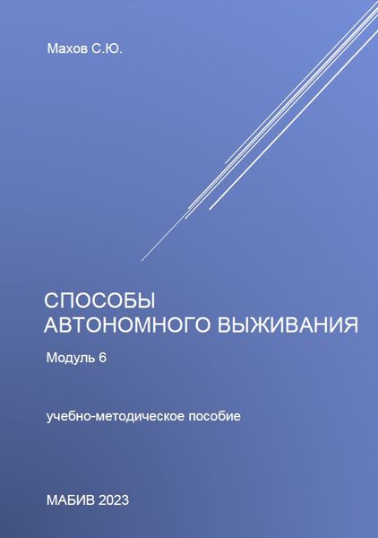 Махов, С. Ю. Способы автономного выживания. Модуль 6 : учебно-методическое пособие / С. Ю. Махов. — Орел : Межрегиональная Академия безопасности и выживания (МАБИВ), 2023. — 35 c. — Текст : электронный // Цифровой образовательный ресурс IPR SMART : [сайт]. — URL: https://www.iprbookshop.ru/134449.html (дата обращения: 20.11.2023). — Режим доступа: для авторизир. пользователей