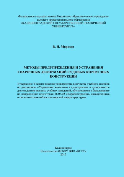 Морозов, В. Н. Методы предупреждения и устранения сварочных деформаций судовых корпусных конструкций : учебное пособие / В. Н. Морозов. — Калининград : Калининградский государственный технический университет, 2015. — 66 c. — Текст : электронный // Цифровой образовательный ресурс IPR SMART : [сайт]. — URL: https://www.iprbookshop.ru/134558.html (дата обращения: 23.11.2023). — Режим доступа: для авторизир. пользователей