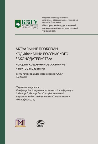 Актуальные проблемы кодификации российского законодательства: история, современное состояние и векторы развития (к 100-летию Гражданского кодекса РСФСР 1922 года). Сборник материалов Международной научно-практической конференции (г. Белгород, Белгородский государственный национальный исследовательский университет, 7 октября 2022 г.)