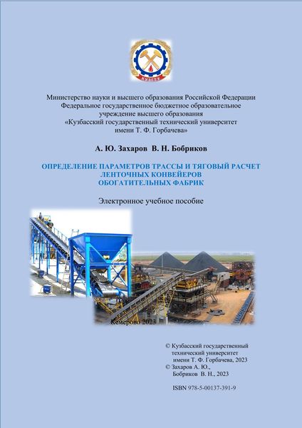 Захаров, А. Ю. Определение параметров трассы и тяговый расчет ленточных конвейеров обогатительных фабрик : учебное пособие для студентов высших учебных заведений / А. Ю. Захаров, В. Н. Бобриков. — Кемерово : Кузбасский государственный технический университет имени Т.Ф. Горбачева, 2023. — 61 c. — ISBN 978-5-00137-391-9. — Текст : электронный // Цифровой образовательный ресурс IPR SMART : [сайт]. — URL: https://www.iprbookshop.ru/135105.html (дата обращения: 15.12.2023). — Режим доступа: для авторизир. пользователей