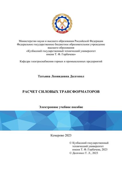 Долгопол, Т. Л. Расчет силовых трансформаторов : электронное учебное пособие / Т. Л. Долгопол. — Кемерово : Кузбасский государственный технический университет имени Т.Ф. Горбачева, 2023. — 123 c. — ISBN 978-5-00137-415-2. — Текст : электронный // Цифровой образовательный ресурс IPR SMART : [сайт]. — URL: https://www.iprbookshop.ru/135107.html (дата обращения: 15.12.2023). — Режим доступа: для авторизир. пользователей